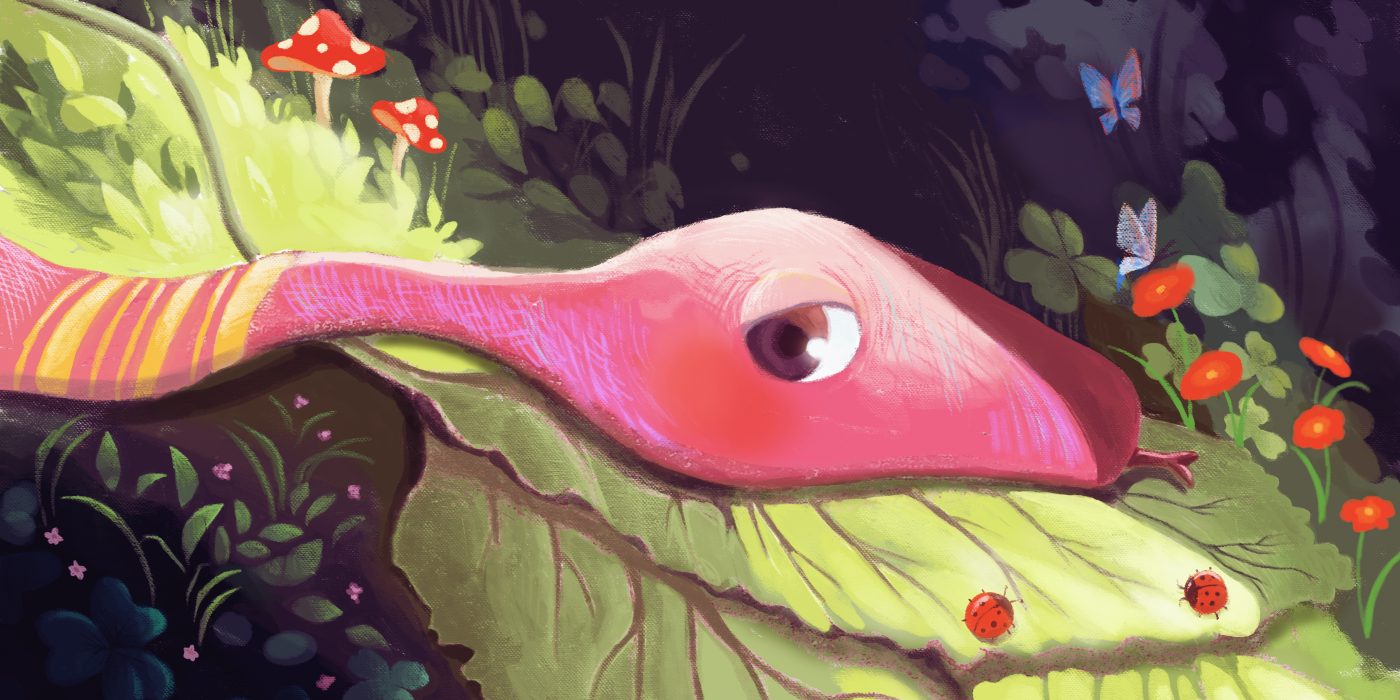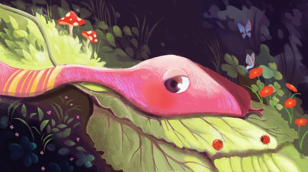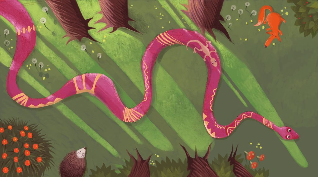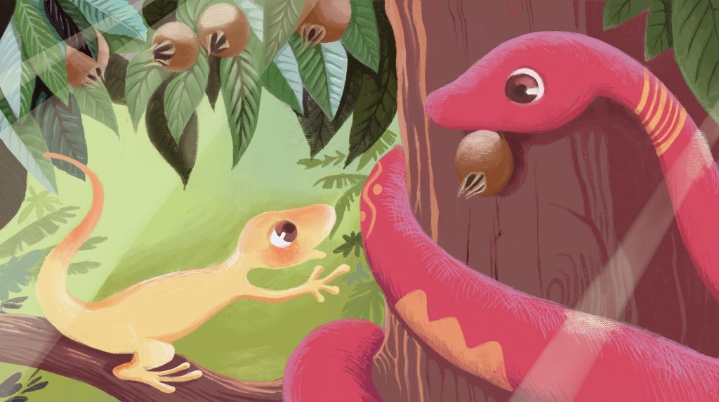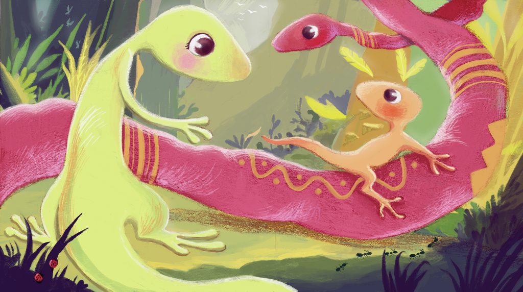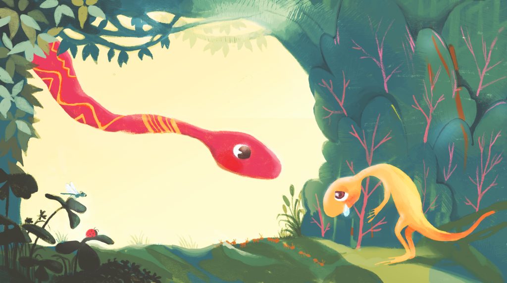 These are the frames of a book called Mooli, which I illustrated for Soore Mehr›s publication. The story is about a crying lizard who makes an adventure with a kind snake! I created this project on 2023, and painted them digitally by Photoshop. All sizas is 43×23
